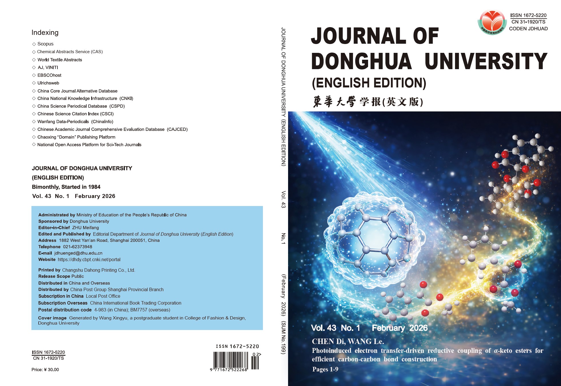 《东华大学学报(英文版)》(Journal of Donghua University(English Edition))是由中华人民共和国教育部主管,东华大学主办,以纺织科学及相关学科为特色的学术性期刊。本刊于1984年创刊,为双月刊,国内外公开发行,ISSN 1672-5220,CN 31-1920/TS。刊物已被Scopus数据库、《世界纺织文摘》(World Textile Abstracts)、俄罗斯《文摘杂志》(AJ, VINITI)、美国艾博思科学术数据库(EBSCOhost)、乌利希期刊指南(Ulrichsweb)、中国核心期刊(遴选)数据库、中国期刊全文数据库(CNKI)、中国学术期刊数据库(CSPD)、中国科学引文索引(CSCI)、中国学术期刊综合评价数据库(CAJCED)、国家科技期刊开放平台(National Open Access Platform for Sci-Tech Journals)、超星(Chaoxing “Domain” Publishing Platform)等权威检索数据库收录,并被评为“中国高校优秀科技期刊” “上海市高校特色科技期刊”。本刊严格执行“三审三校”制度,坚持公正、公平的原则,确保审稿的公正性、严肃性和审稿的质量,以此保证学报的学术质量。本刊以纺织学科及相关学科为特色,主要刊登理论研究、应用技术及其相关领域的科研学术论文。本刊将品牌化、特色化作为工作重点,已开设专栏:纺织柔性电子材料、纺织复合材料、纤维材料与膜科学、人工智能等。